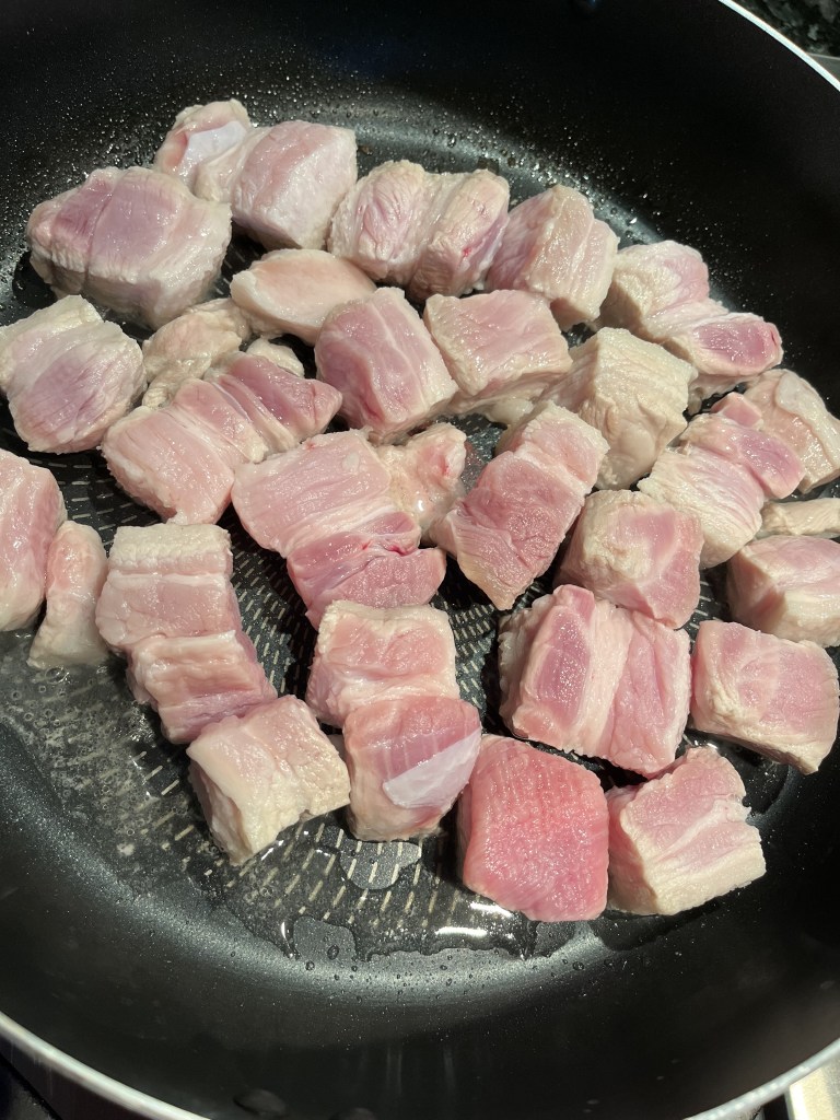 - Put them in the frying pan with no oil, low heat, stir fried them to get oil out of the fat.